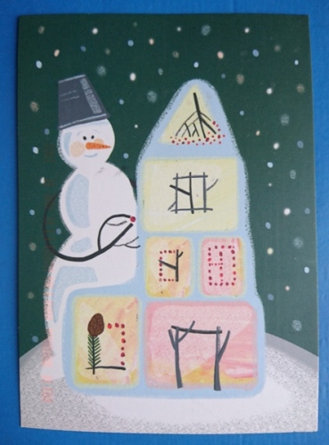 Иллюстрация Алины Федерко. Какой загадочный снеговик, он явно выкладывает руны тем, что под руку попадется. И на марке снеговики. Спасибо, Света.