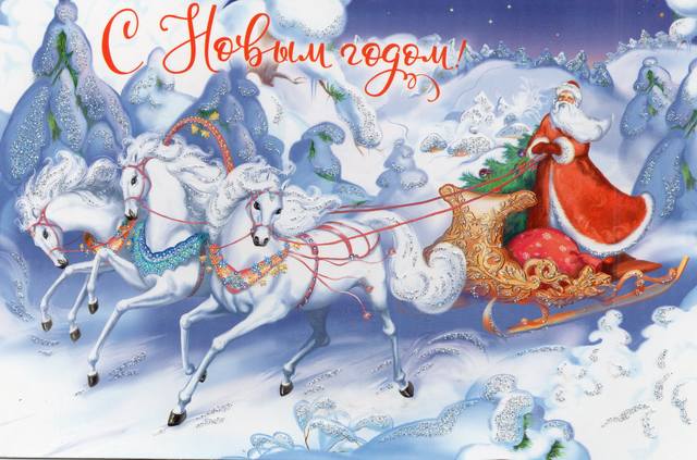 Великолепная зимняя открыточка с Дедом Морозом на санях c поздравлениями и атмосферной рисовкой от Наташи