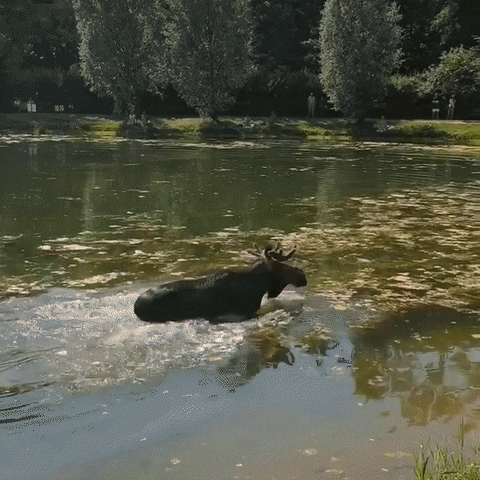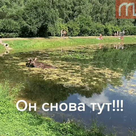 Лось третий день подряд приходит искупаться в пруду в Сокольниках. Отдыхающие реагируют уже совершенно обыденно: ну лось и лось, любит купаться